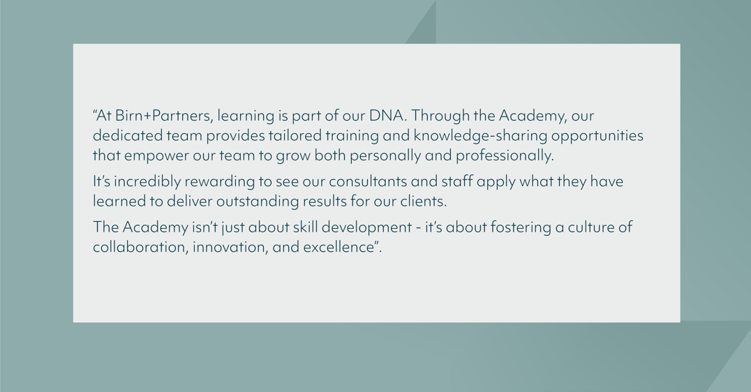 By fostering a culture of learning, the Academy equips our consultants and staff with the tools and insights they need to excel, ensuring we consistently deliver exceptional value to our clients.