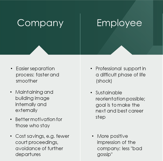 When it comes to staff reduction a well-structured outplacement program is the instrument-of-choice to guide managers and other high-level staff into new responsibilities, in a responsible and cost-effective way creating a win-win-situation (see table).